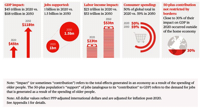 Estimates by AARP in its Longevity Outlook series calculated the economic contributions of Americans ages 50 and older in 2018 at more than $9 trillion, projected to keep rising through 2050 (Fry & Braga, 2023). AARP’s broader “Global Longevity Economy Outlook” (AARP, n.d.) concluded that the ages50 and older population contributed $45 trillion in 2020 to global Gross Domestic Product, accounting for 34% of total global GDP. The chart from this report below illustrates the scale of older adults’ economic contributions.