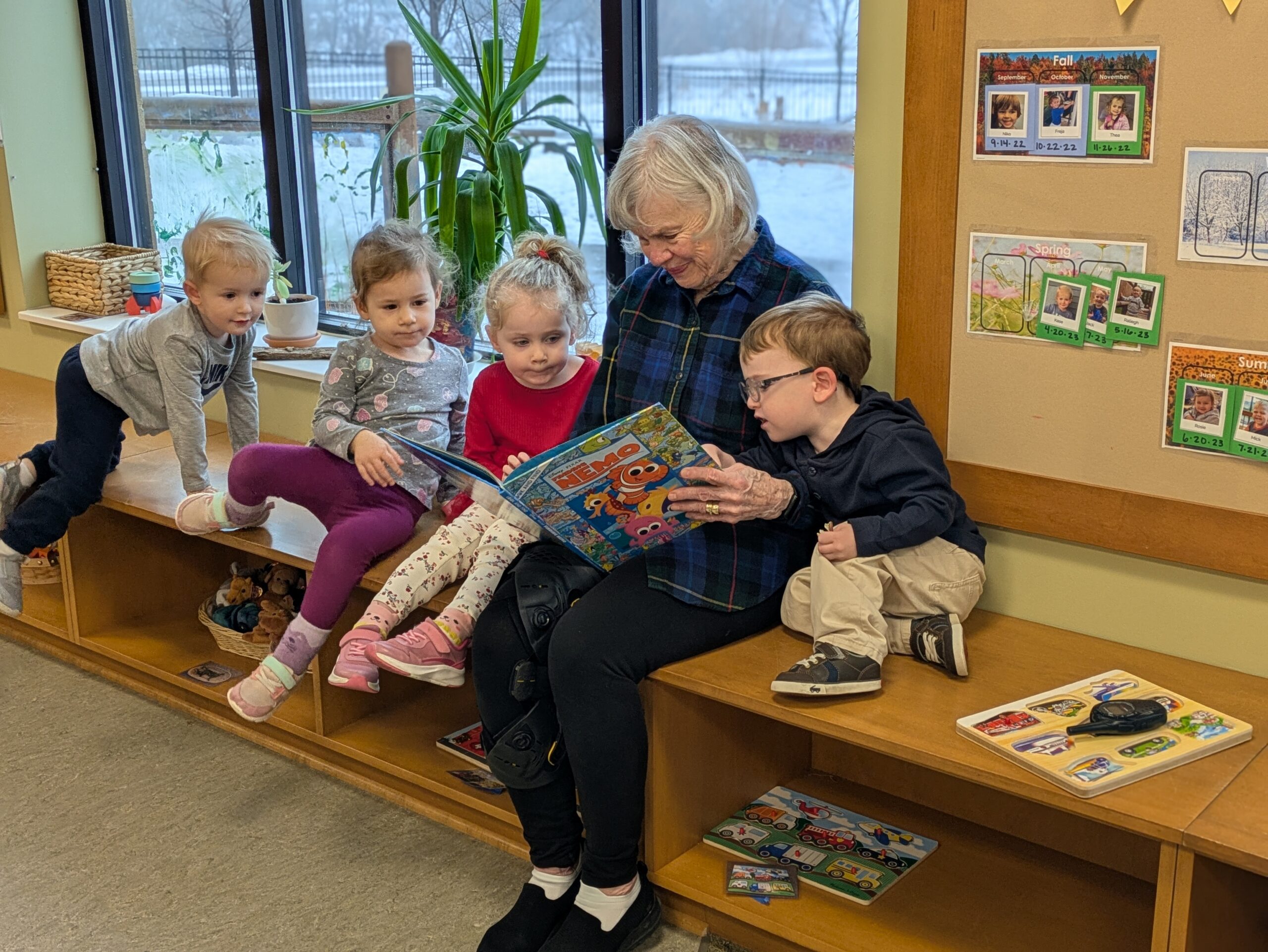 Each classroom also has adopted “grandma” and “grandpa” readers who visit the preschool weekly to read books aloud to the class. The children get to know these special older adults very well, asking them questions about their lives and sharing their excitement about the books they read together. The toddler class has a loyal, energetic grandma who comes into the classroom once a week to offer a lap, a helping hand, or a story she reads to a few children snuggled up on the couch.