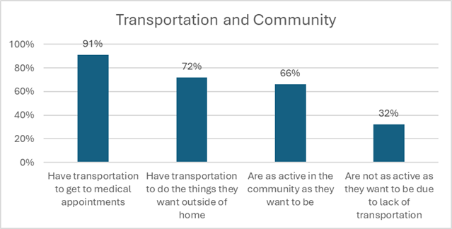 Supporting people to live and access their communities is a primary role of LTSS and is accomplished through providing various medical and non-medical services. Transportation is an important support that makes it possible for people receiving LTSS to participate in their communities. Figure 2, below, shows that while the majority (91%) of participants reported they have transportation to medical appointments, fewer than three quarters of participants reported they had reliable transportation to do things outside of their home when they wanted (72%). Sixty-six percent of respondents said they were as active in the community as they wanted to be. Transportation was one of the most cited reasons for 32% of respondents who were not as active as they would like to be. Access to transportation to do things in the community has remained consistent at just over 70% since the initial year of surveying in 2015.