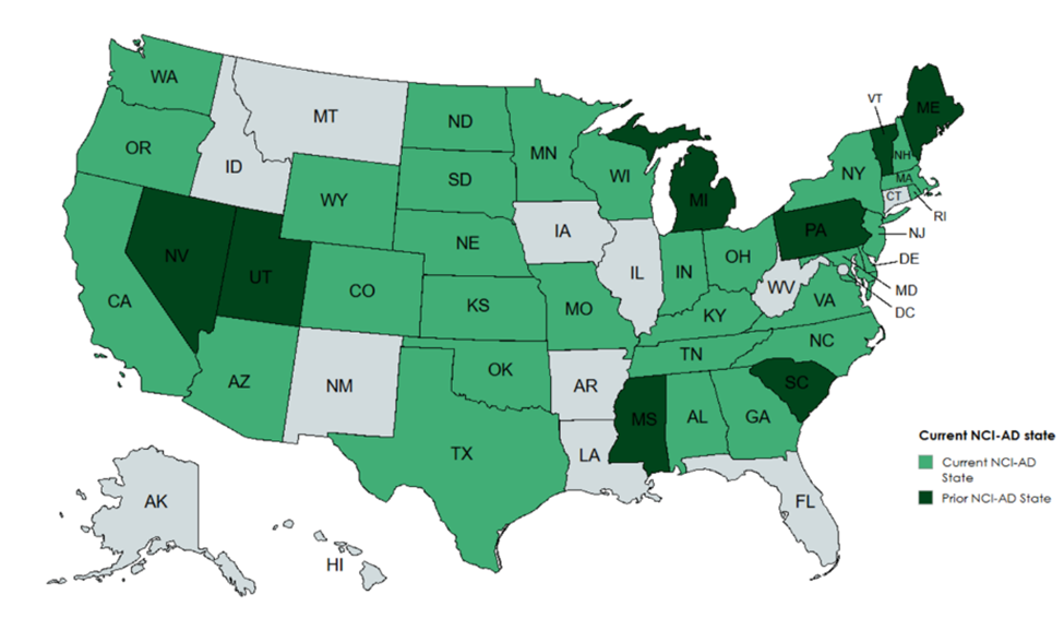 NCI-AD program staff work closely with each participating state to ensure valid and reliable data collection methods are employed, to provide guidance for successful survey completion, and produce annual data findings in an accessible format. The NCI-AD program staff also work closely with state staff to understand their data and implement quality improvement initiatives based on findings at the close of the survey cycle.