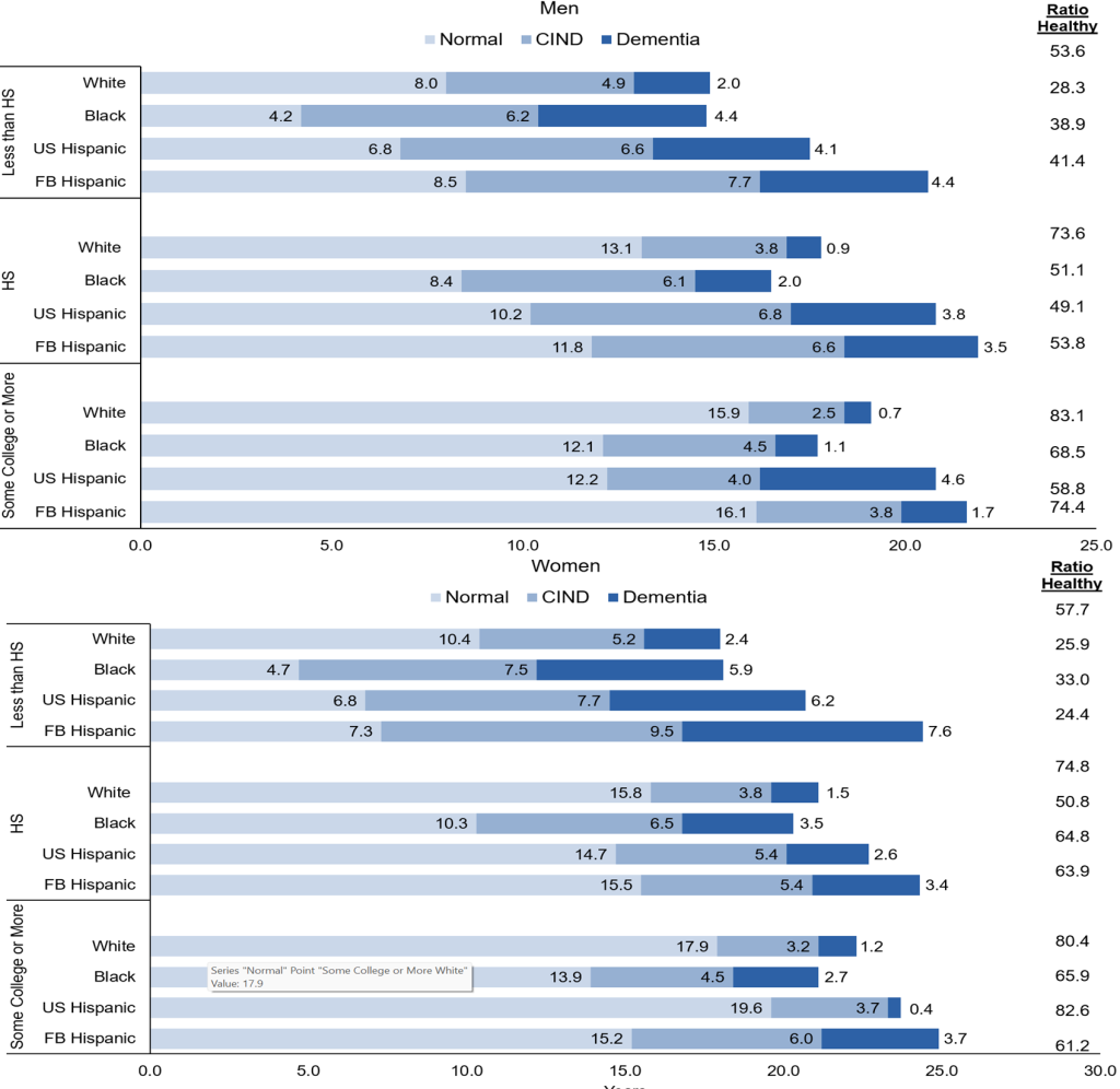 While all Americans have experienced increasing educational attainment over recent decades, persistent racial/ethnic disparities remain. Racial/ethnic disparities in cognitive health outcomes in the United States have been attributed in part to long-standing and deeply rooted inequalities in educational attainment and quality of education. Thus, the above results, coupled with projected demographic changes, highlight the need for programs focused on increasing educational attainment and quality of education, particularly for women and minority populations, to create better equity and improved social and economic outcomes that lead to cognitively healthier lives.